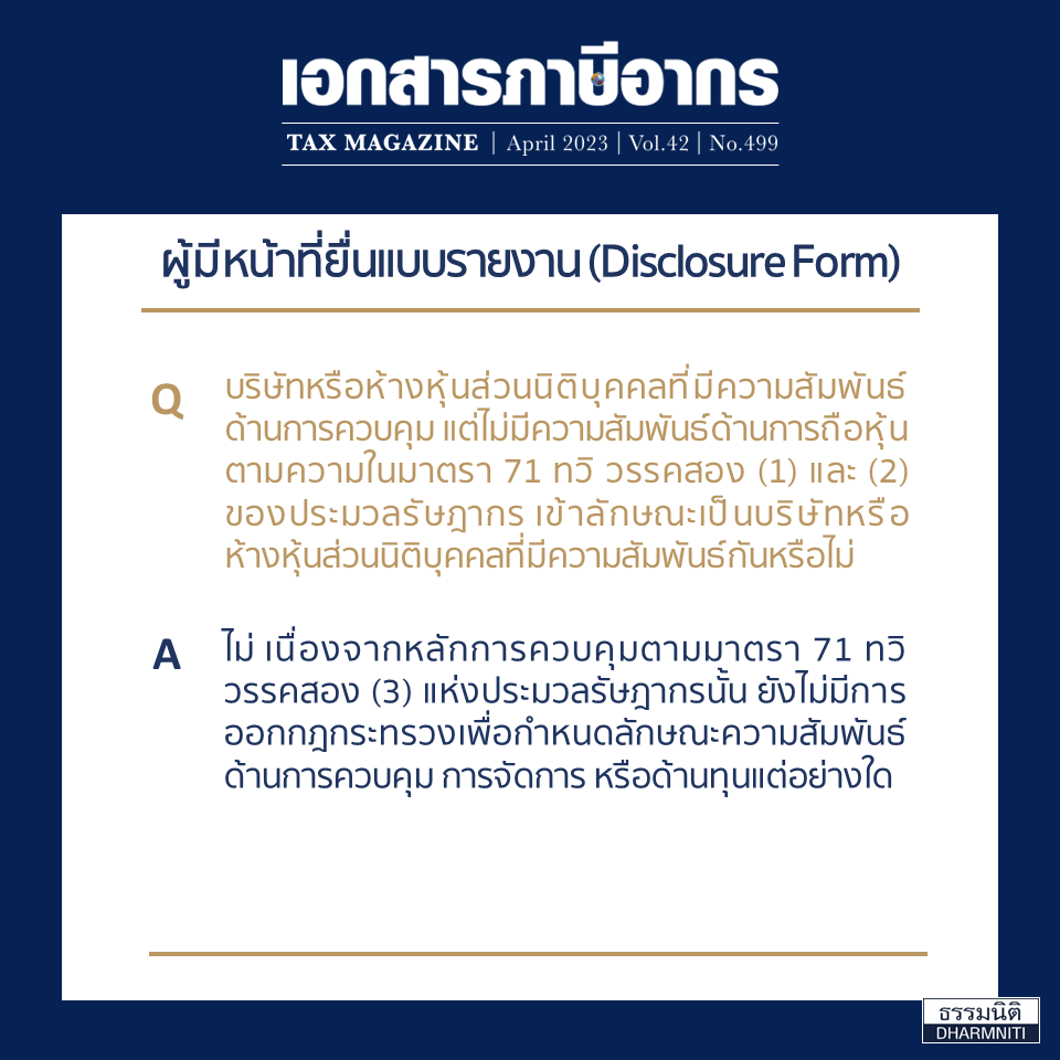 | A ไม่ เนื่องจากหลักการควบคุมตามมาตรา 71 ทวิ วรรคสอง (3) แห่งประมวลรัษฎากรนั้น ยังไม่มีการออกกฎกระทรวงเพื่อกำหนดลักษณะความสัมพันธ์ด้านการควบคุม การจัดการ หรือด้านทุนแต่อย่างใด |