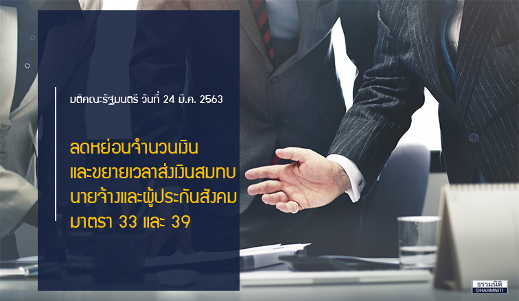 ครม.รับทราบประกาศกระทรวงแรงงาน เรื่อง การขยายกำหนดเวลาการยื่นแบบรายการแสดงการส่งเงินสมทบและการนำส่งเงินสมทบของนายจ้างและผู้ประกันตน และ การลดหย่อนการออกเงินสมทบของนายจ้างและผู้ประกันตน ของผู้ประกันตนมาตรา 33 และ 39 กรณีการระบาดของโรคติดเชื้อไวรัสโคโรนา 2019