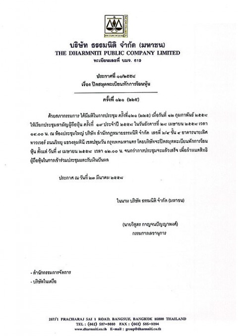 บริษัท ธรรมนิติ จำกัด (มหาชน) ประกาศปิดสมุดทะเบียนพักการโอนหุ้น